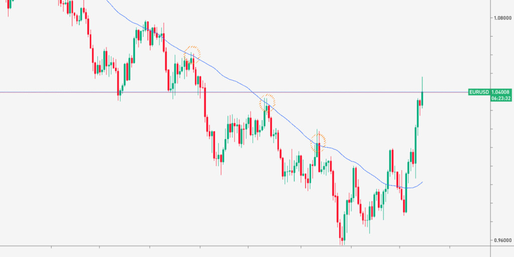 Look at the chart above. It’s a daily chart with a 50-day moving average. The price rebounded from the MA at least three times. You could open a sell position as soon as the price touched the MA and formed a bearish candlestick. Take-profit and stop-loss levels would depend on market conditions.