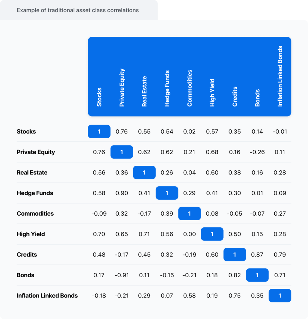 This technique involves analyzing past data to determine how closely or inversely two or more assets have moved in relation to each other. It’s measured on a scale from -1 to 1, with 1 representing a perfect positive correlation, -1 — a negative correlation, and 0 indicating no relationship between the assets. For example, stocks have a lower correlation with commodities (0.02) but a higher correlation with private equity (0.76).