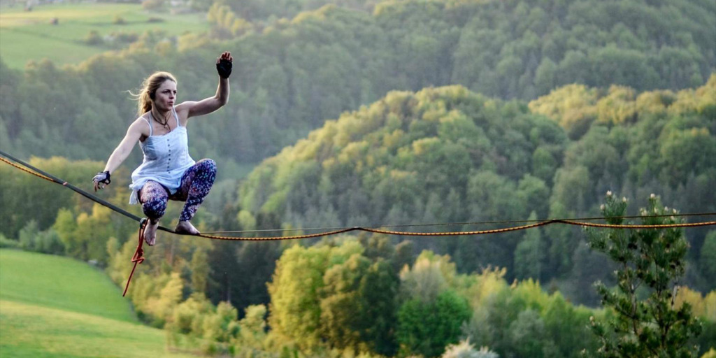 Slacklining entails balancing on a rope pulled between two fixed points. It’s similar to tightrope walking; but in this case, the rope stretches under load and behaves dynamically, making it easier to keep balance.