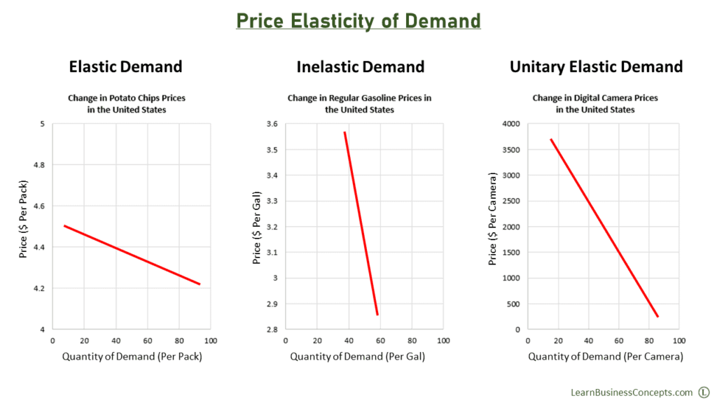 • Unitary – A demand is considered unitary elastic when changes in prices lead to a balanced ratio between price change and quantity demanded, or when the percentage change of quantity demanded is the same as the percentage change of the price. A typical example of unitary elastic demand is electronic goods: household appliances, mobile phones, and other gadgets.