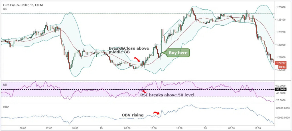 नोट! RSI 50 के स्तर के ऊपर उसी समय नहीं जाएगा जब मूल्य BB को मध्य से तोड़ता है। कभी-कभी हमें बुलिश मोमेंटम के दिखने तक का थोड़ा ज्यादा इंतजार करना पड़ सकता है।