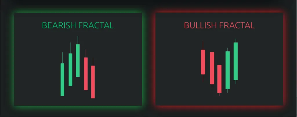 एक फ्रैक्टल में पाँच बार या इससे ज़्यादा होते हैं। पैटर्न के उच्चतम और निम्नतम बिंदु केंद्रीय बार में आते हैं, जबकि अन्य बार के उच्च और निम्न बिंदु क्रमशः निम्न और उच्चतर होते हैं। फ्रैक्टल तब पूरा हो जाता है जब कीमत फ्रैक्टल के डिजाइन के दाईं ओर एक नई उच्च या निम्न के दो बार बनाता है।