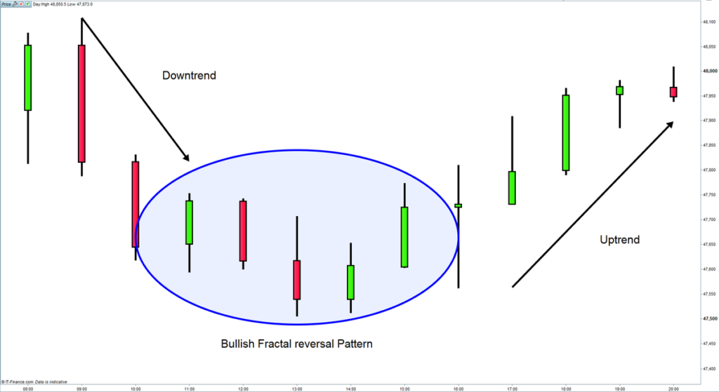 बाजार में ट्रेंड रिवर्सल का पता लगाना फ्रैक्टल इंडिकेटर का एक विशिष्ट अनुप्रयोग है। फ्रैक्टल्स आपको ट्रेंड रिवर्सल की संभावना के बारे में सतर्क कर सकते हैं क्योंकि अपट्रेंड या डाउनटर्न अपनी पकड़ खोना शुरू कर देता है।