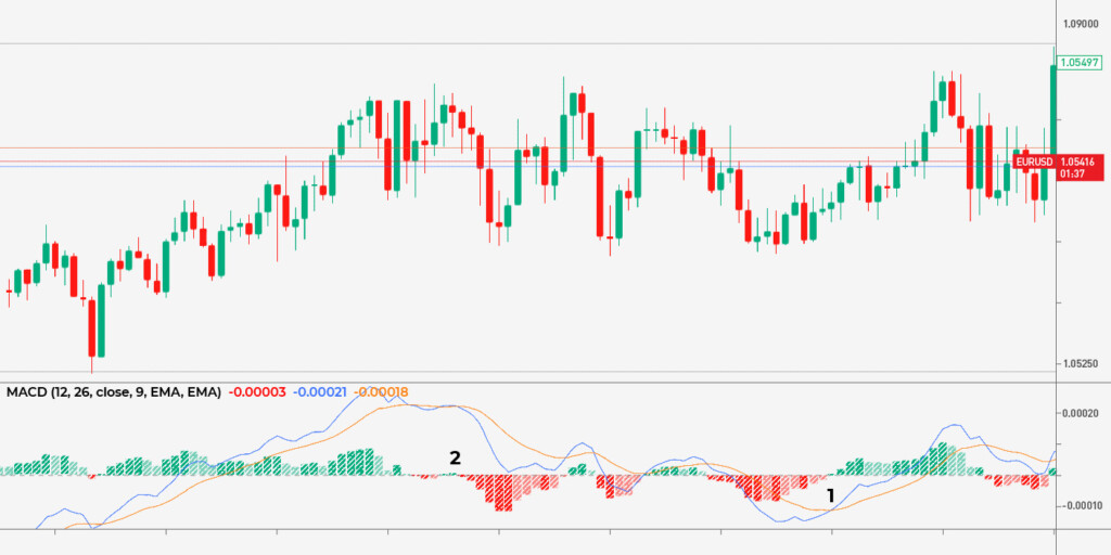 - 0 लाइन क्रॉसओवर। एमएसीडी में एक हिस्टोग्राम और दो लाइनें होती हैं – एमएसीडी और एक सिग्नल लाइन। जब हिस्टोग्राम 0 से ऊपर उठता है, तो यह एक संकेत है कि कीमत बढ़ेगी (1). इसके विपरीत, जब हिस्टोग्राम 0 से नीचे गिर जाता है, तो कीमत में गिरावट की उम्मीद है (2). चूंकि स्केलिंग कम समय सीमा पर की जाती है, व्यापारी ब्रेकआउट होते ही बाजार में प्रवेश करते हैं, न कि जब हिस्टोग्राम 0 से ऊपर या नीचे होता है।