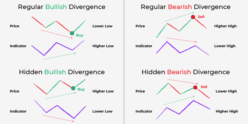- अभिसरण/विचलन। अभिसरण / विचलन एक और लोकप्रिय संकेत है जो स्केलर्स का उपयोग करता है। यह तब दिखाई देता है जब कीमत और एमएसीडी अलग-अलग दिशाओं में चलते हैं – जब कीमत बढ़ती है, एमएसीडी में गिरावट आती है, और इसके विपरीत। चार संकेत नीचे दिए गए चित्र में दिखाए गए हैं।
