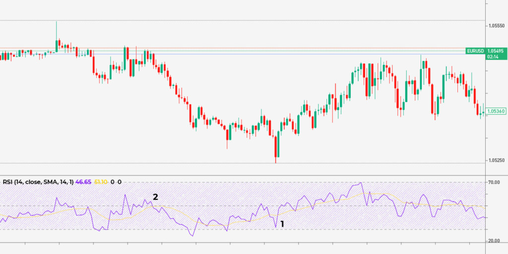 - आरएसआई / एसएमए क्रॉसओवर। लागू एसएमए के साथ आरएसआई संकेतक है। हालाँकि, यदि आपका ट्रेडिंग प्लेटफ़ॉर्म एक प्रदान नहीं करता है, तो आप मैन्युअल रूप से एसएमए को ऑसिलेटर में जोड़ सकते हैं। एसएमए की अवधि आमतौर पर आरएसआई – 14 की अवधि के समान होती है, और मानक विचलन 1 होना चाहिए, क्योंकि एक बड़ा एक छोटी समय सीमा पर संकेतों को कम प्रभावी बना सकता है। जब आरएसआई एसएमए के ऊपर टूट जाता है, तो यह एक खरीद संकेत (1) है। जब आरएसआई एसएमए से नीचे गिर जाता है, तो यह एक बिक्री संकेत है (2).