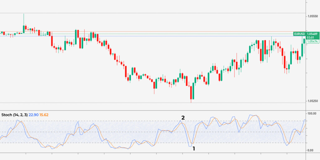 आरएसआई संकेतक के लिए, ओवरबाय / ओवरसोल्ड स्थितियां स्केलर्स के लिए विश्वसनीय संकेत प्रदान नहीं करती हैं। इसलिए, वे विचलन अलर्ट और %K और %D क्रॉसओवर का उपयोग करते हैं: जब %K %D से ऊपर उठता है, तो कीमत बढ़ने की उम्मीद है (1); जब %K %D से नीचे गिर जाता है, तो कीमत में गिरावट की उम्मीद है (2).