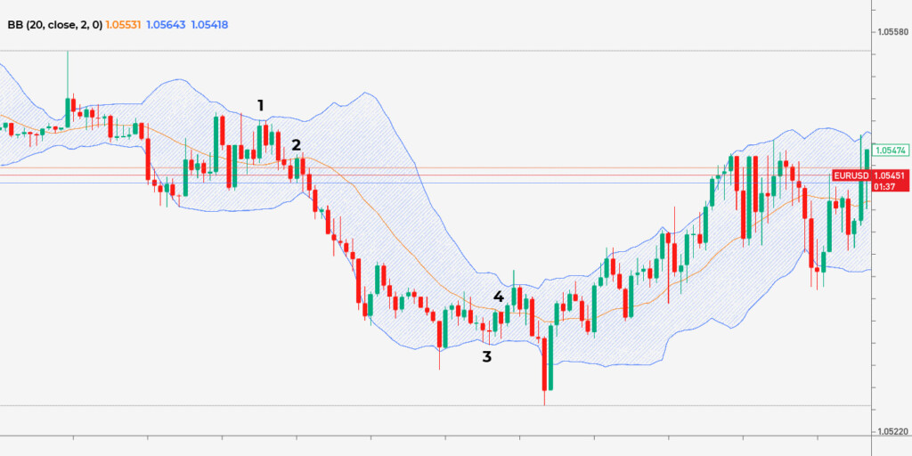खरीदने / बेचने के संकेतों को पकड़ने के लिए, आपको बैंड और मध्य रेखा के सापेक्ष मूल्य स्थान को देखने की आवश्यकता है। जब कीमत ऊपरी बैंड को छूती है, तो यह एक संकेत है कि यह जल्द ही गिर जाएगा (1). यदि मध्य रेखा के नीचे ब्रेक होता है, तो यह एक संकेत है कि गिरावट जारी रहेगी (2). इसके विपरीत, जब कीमत निचले बैंड को छूती है, तो यह जल्द ही बढ़ने की संभावना है (3). मध्य रेखा के ऊपर एक ब्रेक वृद्धि निरंतरता का संकेत देता है (4). आप या तो कई ट्रेड खोल सकते हैं या ट्रेलिंग टेक-प्रॉफिट ऑर्डर का उपयोग कर सकते हैं।