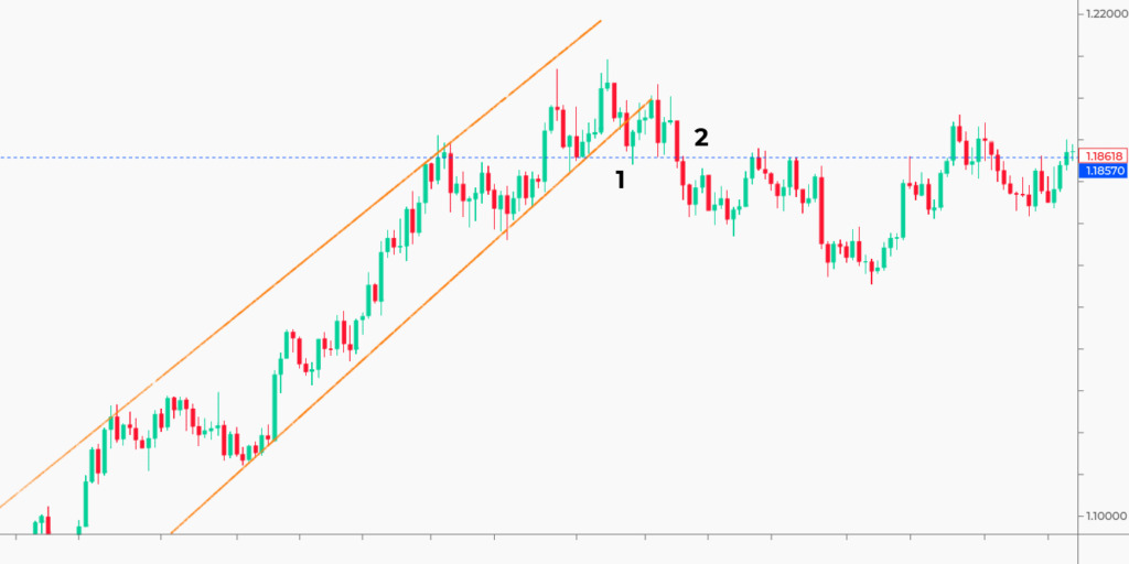 नीचे दिए गए चार्ट में दीर्घकालिक अपट्रेंड को दर्शाया गया है। EUR USD ऊपर की ओर चैनल (समर्थन) के निचले बैंड से नीचे गिर गया। यह एक नकली हो सकता है क्योंकि जोड़ी समर्थन स्तर (1) से पलट गई। हालांकि, कई दिनों बाद, यह इस स्तर (2) से नीचे टूट गया, और अपट्रेंड समाप्त हो गया।