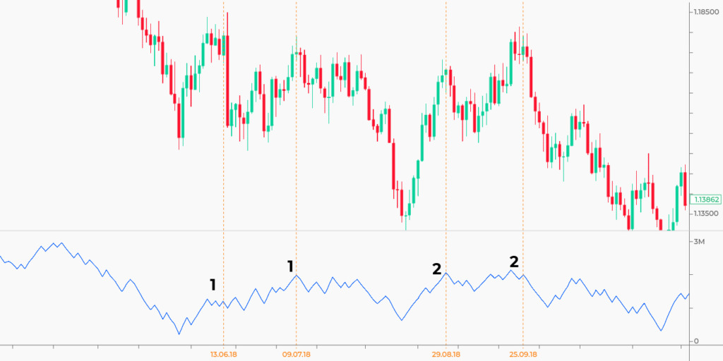 नीचे दिए गए चार्ट में ऑन-बैलेंस वॉल्यूम इंडिकेटर को दर्शाया गया है। जब कोई अपट्रेंड होता है, तो यह बढ़ता है। जब कोई डाउनट्रेंड होता है, तो यह गिर जाता है। जब एक विचलन होता है, तो यह एक प्रवृत्ति परिवर्तन का संकेत देता है।