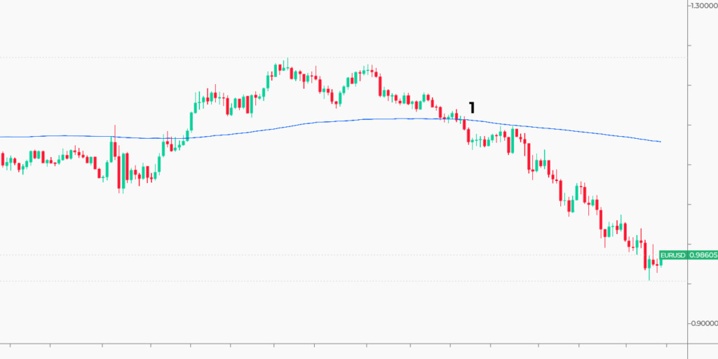 नीचे दी गई तस्वीर 200 सप्ताह के चलती औसत के साथ एक साप्ताहिक टाइमफ्रेम दिखाती है। जब कीमत एमए (1) से नीचे गिर गई, तो एक नए डाउनट्रेंड की पुष्टि की गई।