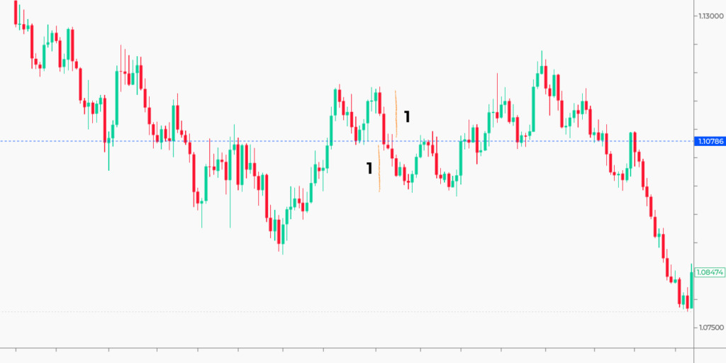 नीचे दिया गया चार्ट डबल-टॉप पैटर्न को दर्शाता है। यह मध्यम अवधि के तेजी की प्रवृत्ति के अंत में बना। नया डाउनट्रेंड छोटा था, लेकिन पैटर्न ने काम किया क्योंकि कीमत सबसे ऊपर और नेकलाइन (नीली रेखा) के बीच की दूरी (1) चली गई, जो पैटर्न का लक्ष्य था।
