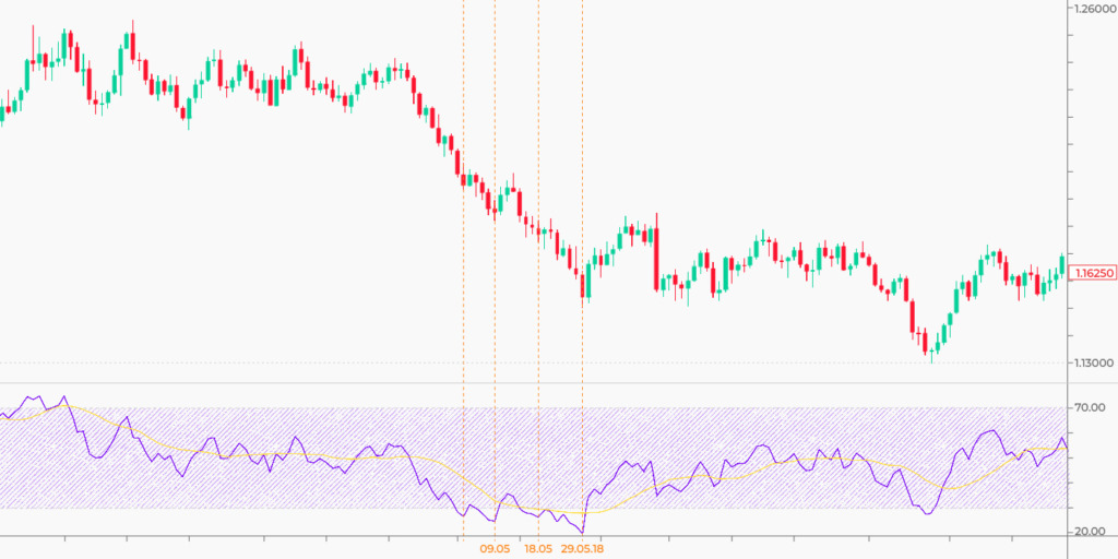 आप सापेक्ष शक्ति सूचकांक के साथ ऐसी बाजार स्थितियों की पहचान कर सकते हैं। जब आरएसआई लाइन 70 के स्तर से ऊपर होती है, तो बाजार को ओवरबॉट किया जाता है। जब आरएसआई 30 के स्तर से नीचे होता है, तो बाजार ओवरसोल्ड हो जाता है।