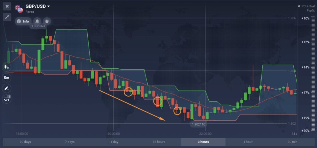 • बैंड की ढलान मार्केट की प्रवृत्ति को निर्धारित करने में महत्वपूर्ण भूमिका निभाती है। जब मार्केट ट्रेंड कर रहा है, तो इंडिकेटर एक ध्यान देने योग्य ढलान प्रदर्शित करेगा, जो कीमतों में स्पष्ट दिशात्मक मूवमेंट को इंगित करता है।