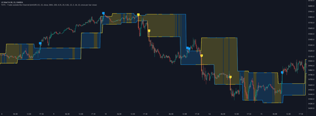 ऊपरी बैंड प्राइस हाई को जोड़कर बनाया गया है, जबकि निचला बैंड कीमत के निचले हिस्से को जोड़ता है। नतीजतन, बैंड अनिवार्य रूप से प्राइस चार्ट के मूवमेंट का पालन करते हैं, लेकिन एक उल्लेखनीय अंतर के साथ – वे प्राइस शोर को सुचारू करते हैं, केवल महत्वपूर्ण प्राइस मूवमेंट्स पर ध्यान केंद्रित करते हैं। इन बैंडों को देखकर, ट्रेडर आसानी से आकलन कर सकते हैं कि मार्केट ट्रेंडिंग या नॉन-ट्रेंडिंग चरण में है या नहीं।