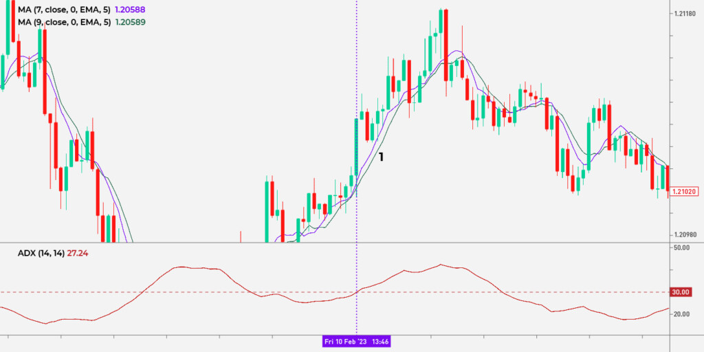 - मूल्य वृद्धि तब हो सकती है जब 7-पीरियड EMA 9- पीरियड के EMA से ऊपर चला जाता है, कीमत सबसे छोटी मूविंग एवरेज से ऊपर रहती है, ADX संकेतक 30 के स्तर से ऊपर टूट जाता है, और कीमत सबसे शोर्ट EMA (1) को रिटेस्ट करती है।