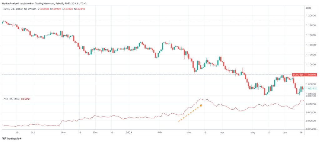 उच्च और निम्न अस्थिरता के लिए ATR का कोई विशेष मूल्य नहीं है। बढ़ती अस्थिरता की डिग्री निर्धारित करने के लिए, आपको संकेतक के हाल के मूल्य का मूल्यांकन करना चाहिए और इसे औसत के रूप में लेना चाहिए। यदि रेखा औसत से ऊपर उठती है, तो अस्थिरता की डिग्री बढ़ जाती है। यदि यह औसत से नीचे चलती है, तो अस्थिरता की डिग्री कम हो जाती है।