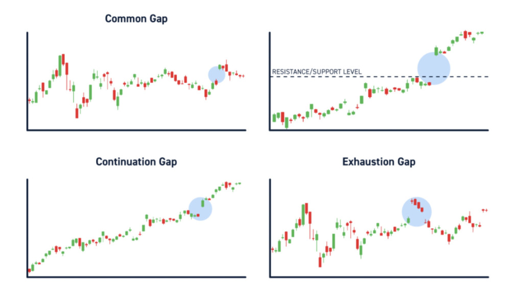 एक अन्य वर्गीकरण ट्रेडर्स के व्यवहार पर आधारित है। कॉमन, ब्रेकअवे, रनअवे और थकावट गैप इग्ज़ॉस्चन गैप हो सकते हैं।