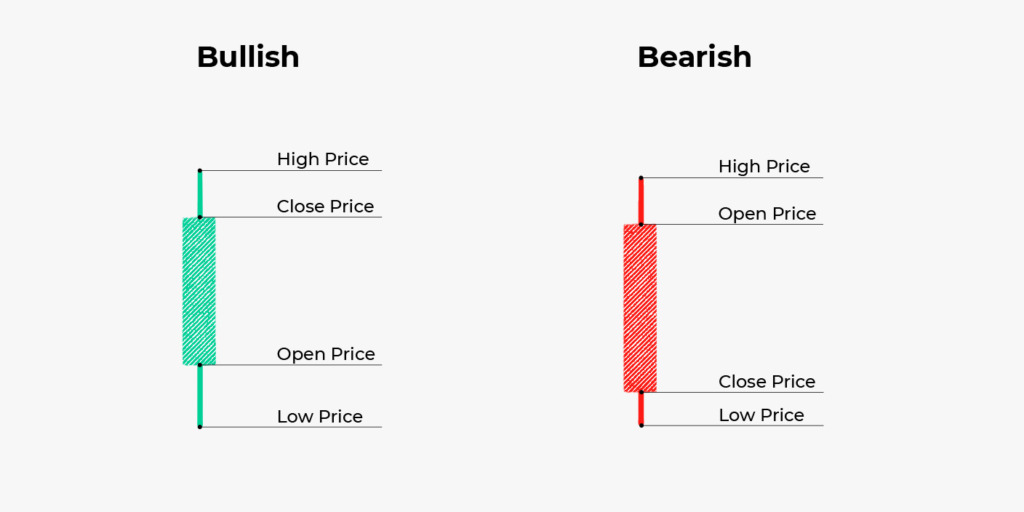 Candlesticks have different colors. Usually, white or green stands for a bullish candle, while black or red is used to reflect a bearish candle. If you use a daily timeframe, one candle will reflect an asset’s open, close, highest, and lowest values for one day. If you trade on a 5-minute chart, every candle will reflect an asset’s prices for 5 minutes.