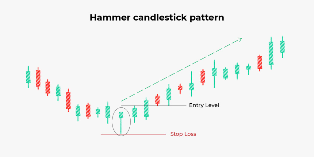 A hammer is a candlestick pattern that consists of one candlestick. It has a small body that is at least two times smaller than the lower shadow. It appears at the end of the bearish trend. As the lower shadow is long and the body is small, it’s a sign bears didn’t have the strength to pull the price further. You could draw a resistance line above the hammer candlestick and enter the market if the price broke above it. A stop-loss order could be slightly below the lowest value of the hammer.