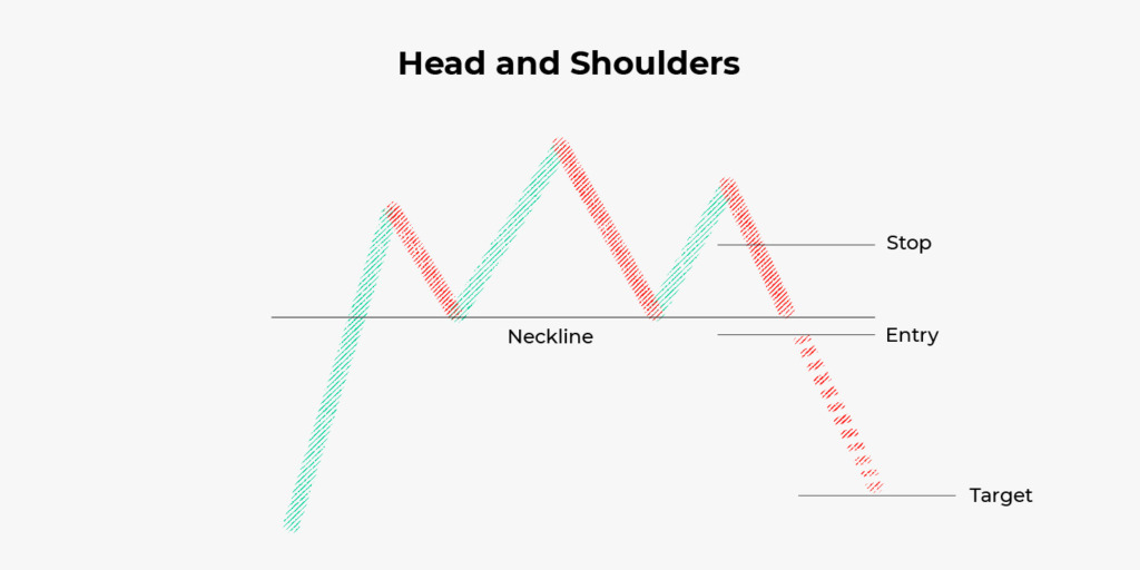 Head and shoulders is a chart pattern that reflects a trend reversal. It includes three tops, where the second one is the highest. Draw a neckline through troughs between the head and its shoulders. It will serve as support. If the price falls below it after the second shoulder’s formation, open a sell trade some points below the neckline. Your target will equal the distance between the head and the neckline. A stop-loss order can be placed slightly above the neckline. The distance always depends on the price volatility.