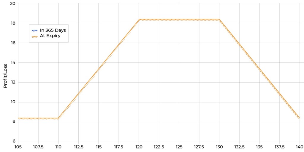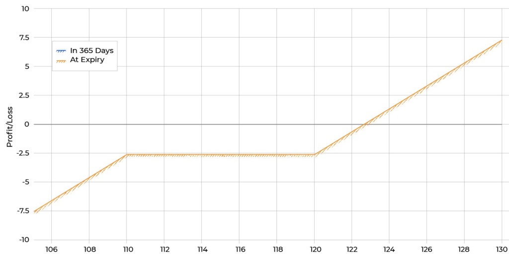 Grafik yang menunjukkan “titik mati” antara 110 dan 120. Di sini, untung/rugi tetap