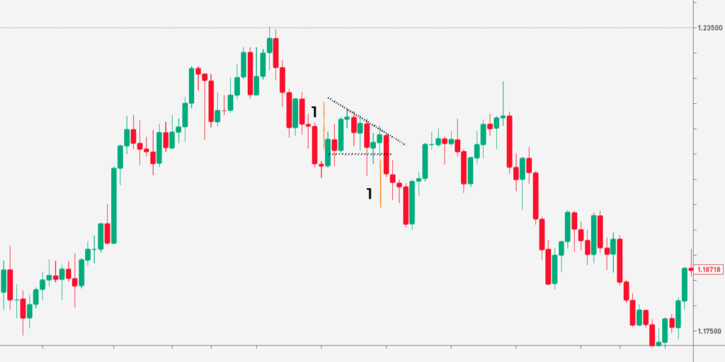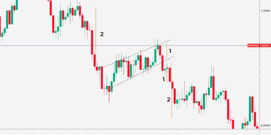 Buka perdagangan dalam arah breakout. Level take-profit dapat didasarkan pada jarak antara batas bendera (1) atau panjang tiang benderanya (2). Tiang bendera adalah jarak yang ditempuh harga sebelum bendera terbentuk. Pendekatan pertama bersifat konservatif sehingga dapat digunakan di pasar yang sangat fluktuatif. Pendekatan kedua cocok untuk pasar yang stabil, karena jauh lebih berisiko.