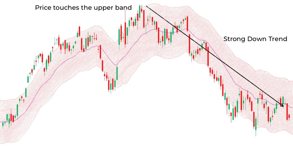 You can see from the figure below that a strong indication of a downtrend is given when the price hits the upper band, and the upper line likewise points upward.