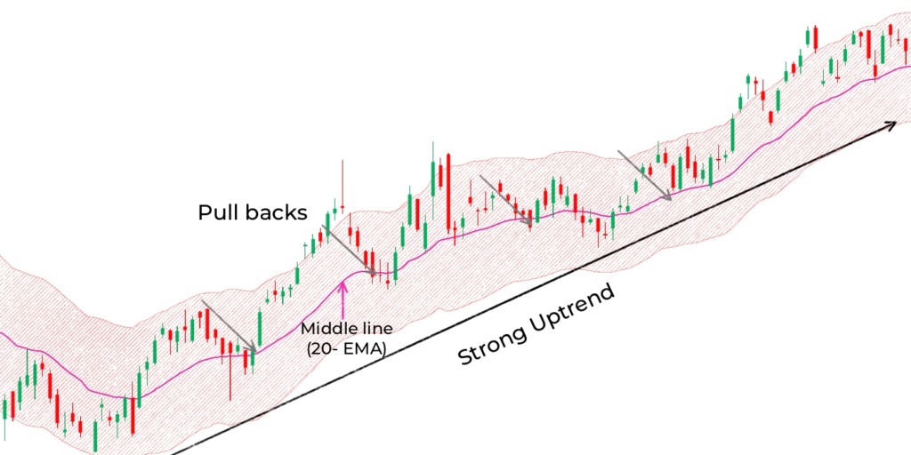 You can observe from the chart below that the price seems to fluctuate close to the midline (20-EMA) when there is a significant upward trend.
