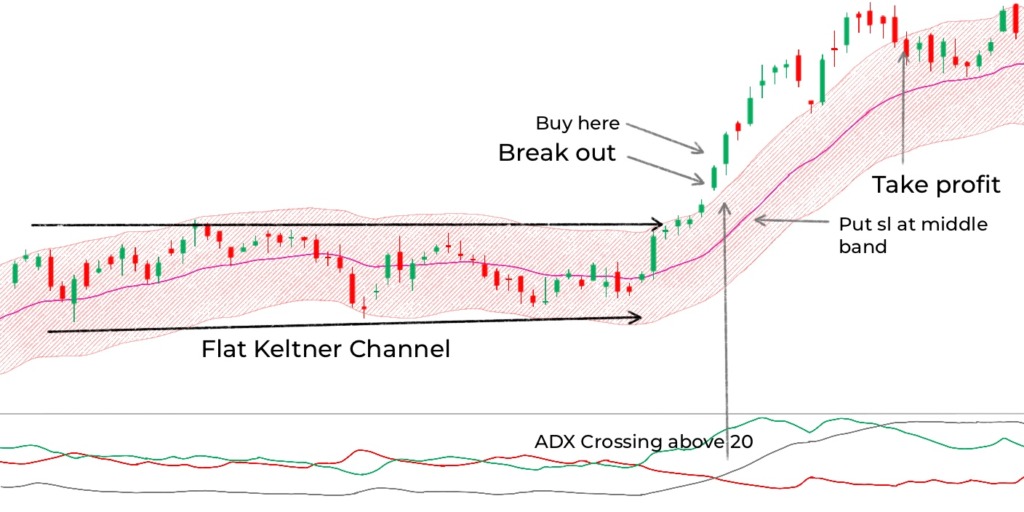 There are strong prospects of a trend reversal when the price closes near the edge of the lower or upper channel. A hint that the price will shortly break out is indicated when the Keltner channel advances in a flat direction.