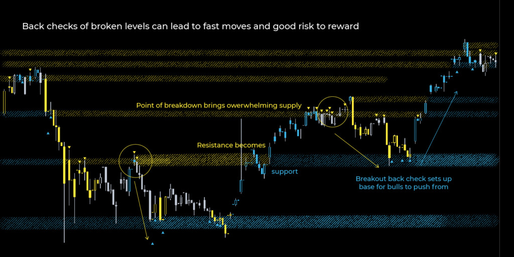 Como regra, ao negociar com indicadores técnicos, considera-se que sempre que houver um rompimento na zona de suporte, essa zona se tornará instantaneamente uma zona de resistência. Da mesma forma, quando há um rompimento em uma zona de resistência, essa zona imediatamente se torna uma zona de suporte. Portanto, no geral, o reteste de preços ou as verificações anteriores são úteis ao rastrear tendências em sua negociação.