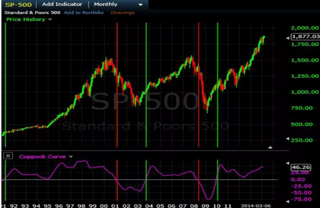 Diagrama mostrando o gráfico mensal do S&P 500 com a curva de Coppock