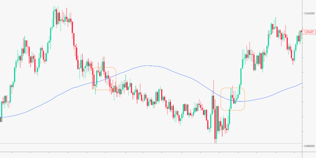 Você pode notar que os períodos MA diferem. No gráfico diário, a MA tem um período de 50; no gráfico horário, o período é 21. Você deve saber que quanto menor o período do MA, mais frequentemente ele interage com o preço. No entanto, aplicar o período de 21 ao gráfico diário seria errado porque existem regras de período que você deve seguir.