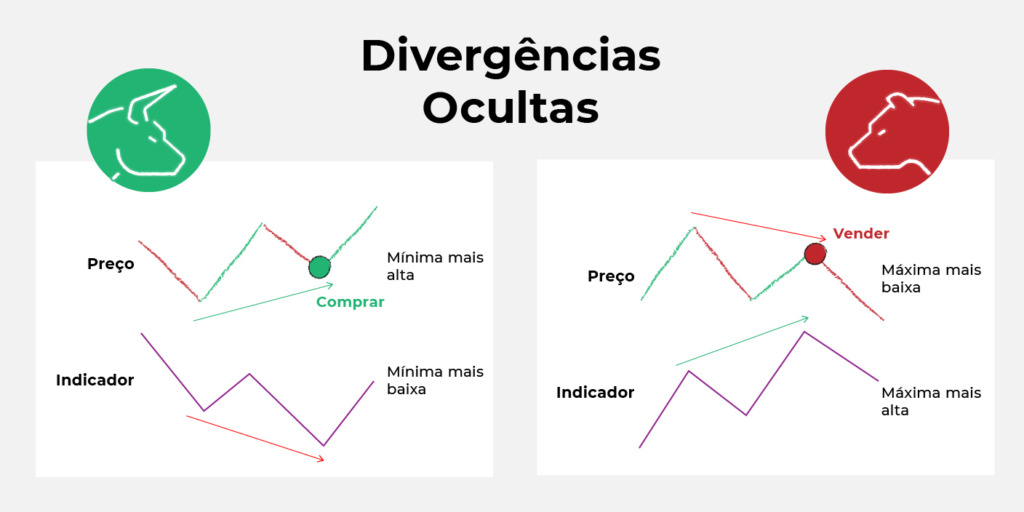 Uma divergência de alta oculta ocorre quando o preço forma mínimos mais altos, mas o indicador diminui, criando mínimos mais baixos. É um sinal de que o preço continuará se movendo na tendência de alta. Você pode manter sua negociação ou abrir uma nova na direção da tendência.