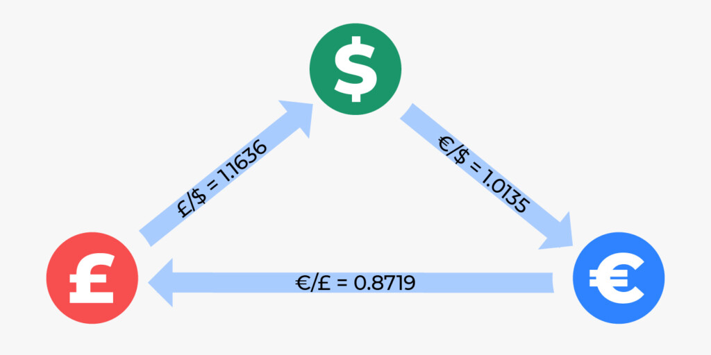 Você deve escolher três pares interconectados — por exemplo, EUR/USD, GBP/USD e EUR/GBP. Imagine, suas taxas atuais são 1,0135, 1,1636 e 0,8719, respectivamente.