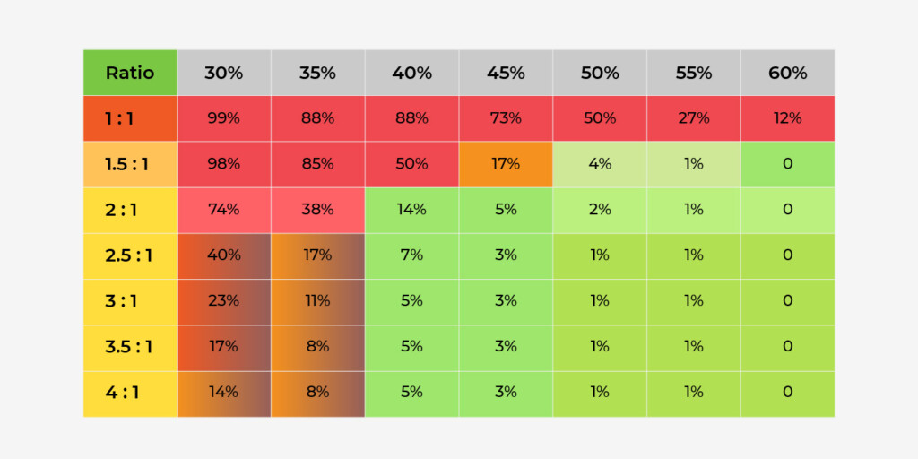 Quanto maior a proporção de take-profit para stop-loss, menor a probabilidade de fechar uma negociação com retorno. No entanto, uma boa estratégia tem uma relação ideal de retornos e perdas. Existem várias maneiras de atingir esse objetivo: