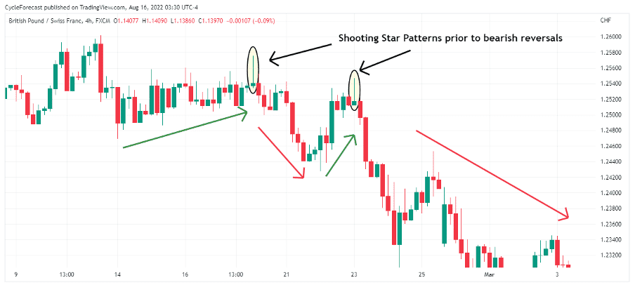The idea behind a bearish inverted hammer is to apply pressure to the close of the candle below the opening price. This gives the bearish Shooting Star more power to reverse the bullish trend.