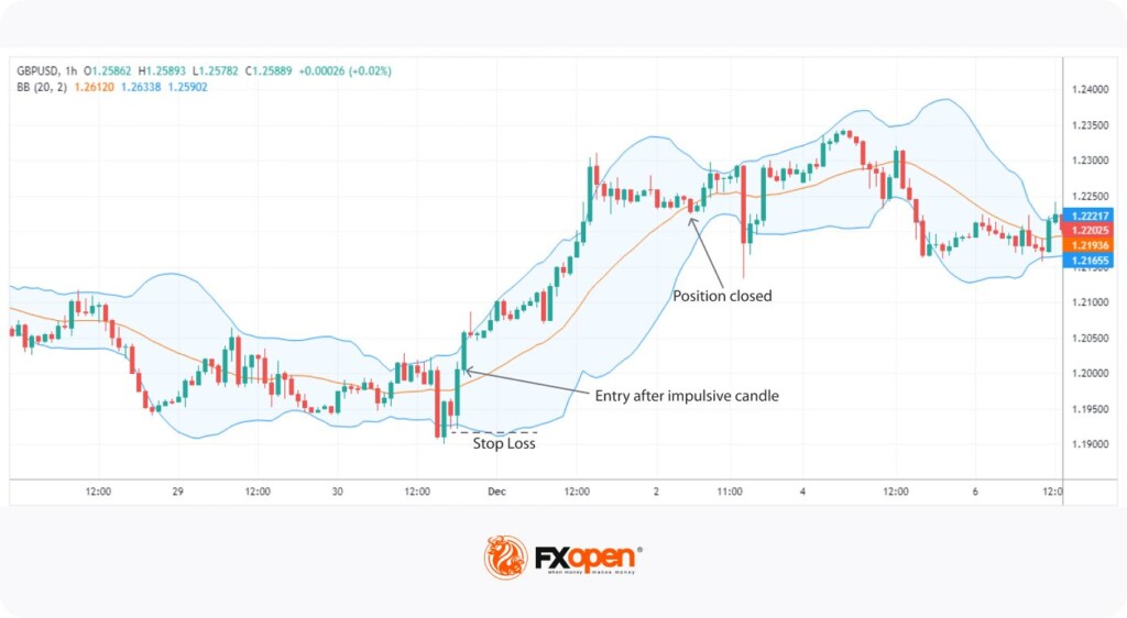 Once you see this strong candle, that’s your cue; get ready to take action when that candle is done. You’ve got a few choices for where to place a safety net (stop loss) — you can put it slightly above or below that strong candle or even outside those Bollinger Bands. Generally, traders finish up the trade if the price goes back above or below that average line.
