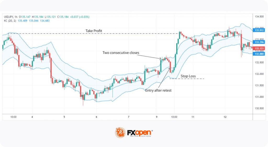 Start by adjusting the indicator using an ATR length of 20 and a multiplier of 2. Next, watch for two consecutive periods where closing prices extend beyond the channel’s edges. Once you spot these two closes, keep an eye on the price as it pulls back to touch the exponential moving average line. When the price meets this line, it’s time to act.