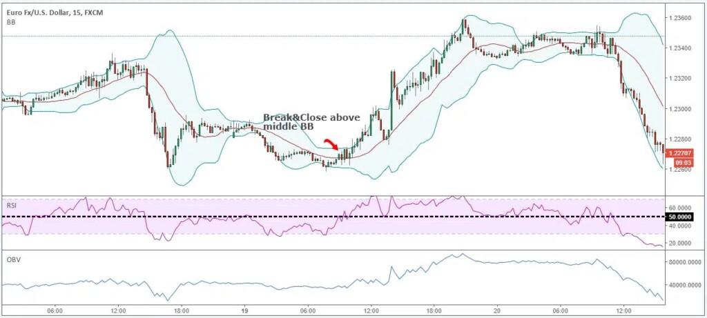 Note! The RSI will not break above the 50 level at the same time that the price breaks the middle BB. Sometimes we need to wait longer until bullish momentum appears.