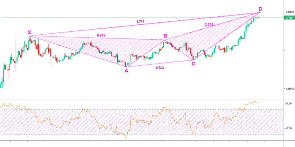 Below is a chart representing a bearish butterfly pattern forming on the GBP/USD price chart. Take note of the bearish affirmation by the RSI indicator below the chart, showing overbought levels.