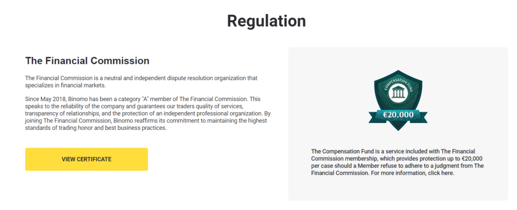 Binomo, finansal piyasalarda uzmanlaşmış bağımsız bir ihtilaf çözümü kuruluşu olan Finans Komisyonu tarafından denetlenmektedir. Şirket, 2018’den beri Uluslararası Finans Komisyonu’nun “A” kategorisinin üyesidir. Bu kategori kalite, güvenilirlik, güvenlik ve koruma garantisi sunar.