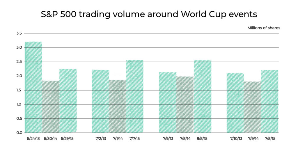 2010 Dünya Kupası sırasında, Avrupa Merkez Bankası Akademisyenleri tarafından 15 ülkenin piyasalarındaki işlem faaliyetlerinin analizi, işlem sayısında %45’lik bir düşüş ve işlem hacminde %55’lik bir düşüş olduğunu ve bir gol atıldığında daha da düştüğünü ortaya koydu. Brezilya’da, milli takımın maçı olduğunda %75’lik bir düşüş kaydedildi ve Şili’de, işlemin hafif bir duraklamaya girdiğini söyleyebiliriz.