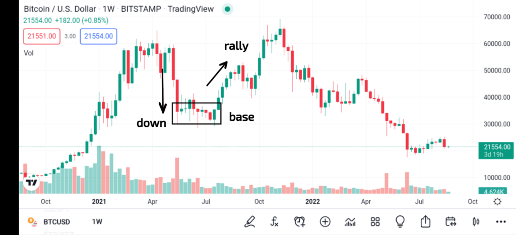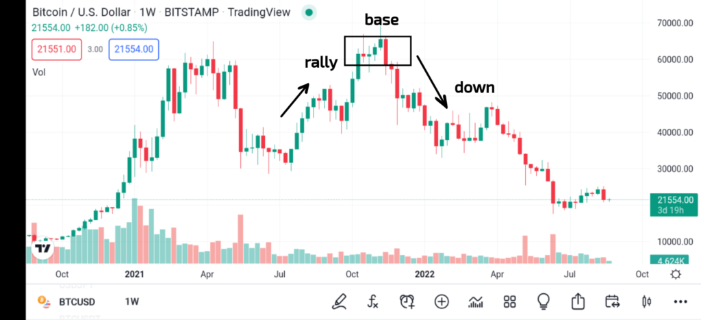 Rally-base-drop: Fiyat yükseldikten sonra, bir taban oluşturmak için orada kalır, sonunda büyük tedarik emirlerinin yerine getirilmesi nedeniyle düşer.