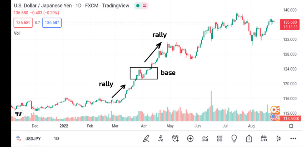 Rally-base-rally: Trend yukarı yönlü bir fiyat hareketi, kısa bir duraklama ve daha güçlü bir ralli gösteriyor.
