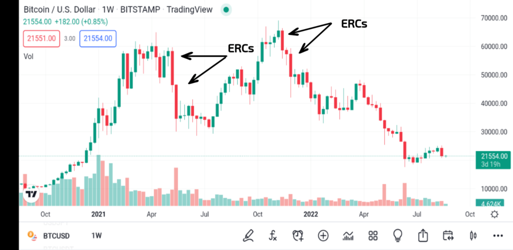 Önemli fiyat değişikliklerini belirledikten sonra, genişletilmiş aralıklı mumları bulmanın zamanı geldi. Bunlar uzun gövdeli, fitilleri olmayan mumlardır. Eşit gövdeli ve fitil büyüklüğündeki mumlar ERC olarak kabul edilmez.