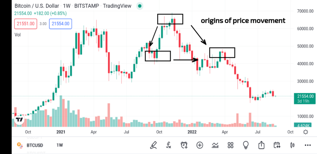 Son adım, fiyat hareketinin kökenini belirlemektir. Aşağıdaki grafikte gösterildiği gibi, fiyat hareketi kökenleri genellikle her arz veya talep bölgesinin temelidir.