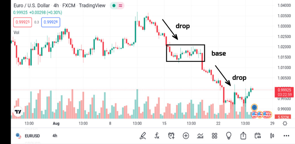 Drop-base-drop: Bu trend bir fiyat düşüşünü, bir baz oluşturmak için bir duraklamayı, ardından daha fazla fiyat düşüşünü gösterir.