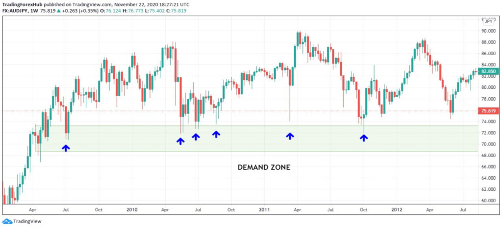 Öte yandan, bir talep bölgesi, fiyat grafiğinde yatırımcıların satın alma emirleri verdiği bir alandır. Bu bölge her zaman mevcut fiyatın altındadır ve yüksek bir satın alma potansiyeli veya ilgisi gösterir. Bu, alıcıların fiyat tetikleyicisi tarafından tamamlanmayı bekleyen siparişleri olduğu anlamına gelir. Bir talep bölgesinin nasıl göründüğünü görmek için aşağıdaki tabloya bakın.