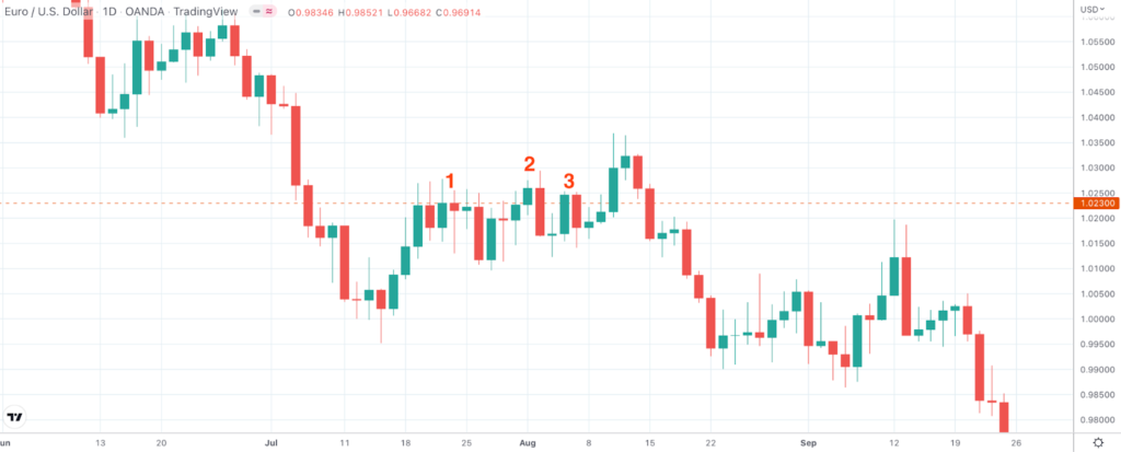 Look at the chart above. The price of the EUR/USD pair rebounded from the level at $1.0230 several times (1). Later, the price went slightly beyond it (2). However, it was still near $1.0230. After, EUR/USD stopped near $1.0230 again (3).